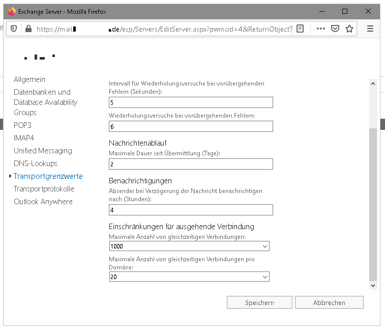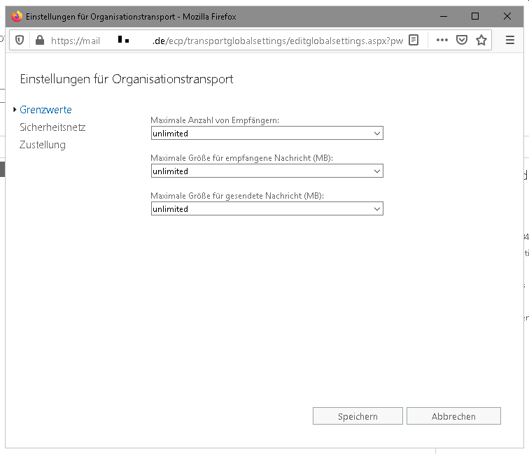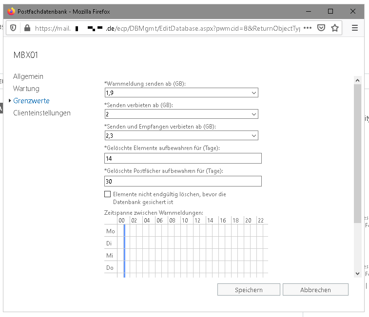 Grenzwerte für die Größe der Postfächer werden pro Datenbank angegeben. Im ECP zu finden unter Server > Datenbanken