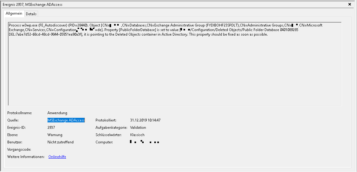 Process w3wp.exe (FE_Autodiscover) (PID=28440). Object [CN=SRV01,CN=Databases,CN=Exchange Administrative Group (FYDIBOHF23SPDLT),CN=Administrative Groups,CN=XXX,CN=Microsoft Exchange,CN=Services,CN=Configuration,DC=XXX,DC=de]. Property [PublicFolderDatabase] is set to value [XXX.de/Configuration/Deleted Objects/Public Folder Database 0401089285 DEL:7abe7d52-68cd-48cd-9844-03851ea90a3f], it is pointing to the Deleted Objects container in Active Directory. This property should be fixed as soon as possible.