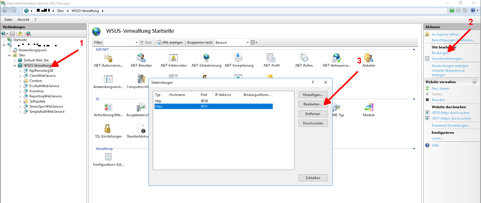 - Die HTTPS-Bindung auf den Port 8531 bearbeiten, darin das korrekte Zertifikat zuweisen.