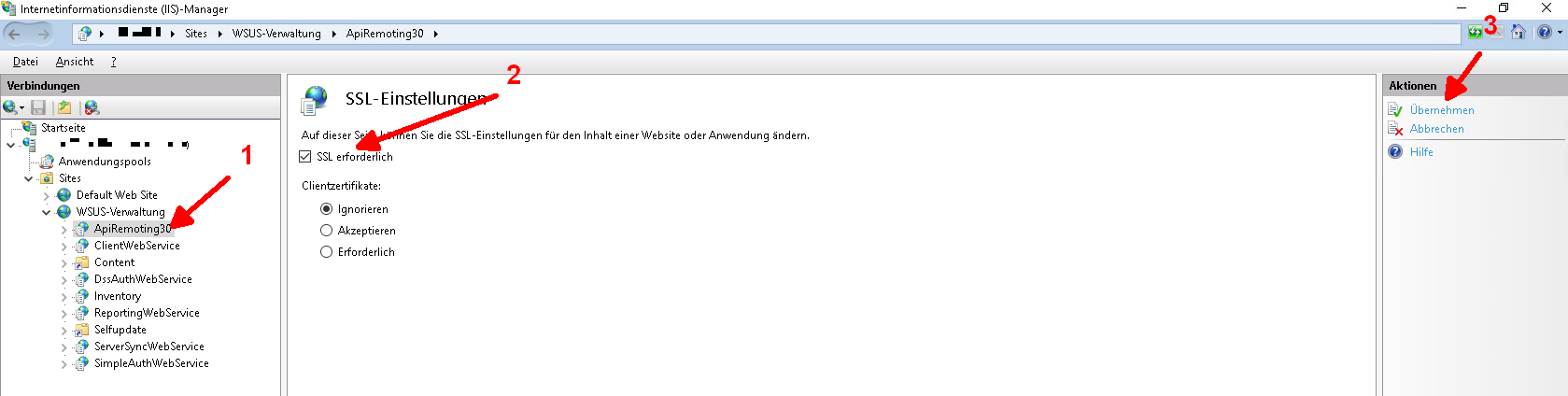 Für folgende virtuelle Verzeichnisse sollte nun die Kommunikation über SSL erzwungen werden: