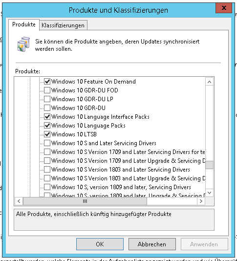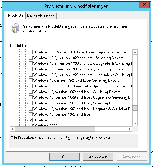 Um Updates für Windows 10 Release 1903 oder höher zu verteilen, muss entsprechende separate Produktgruppe im WSUS aktiviert werden!